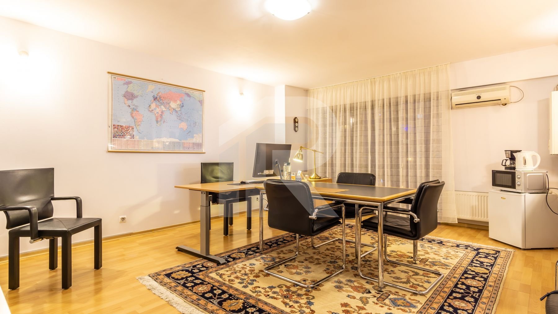 Incalzirea si apa calda sunt asigurate cu centrala termica proprie pe gaze, iar racirea cu 1 aparat de aer conditionat. Ferestrele sunt din aluminiu cu geam termopan.