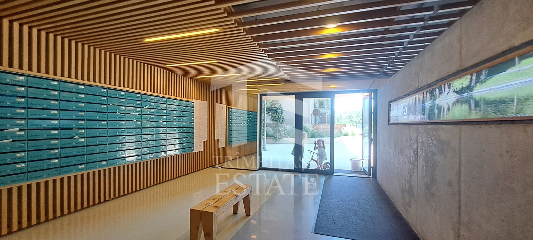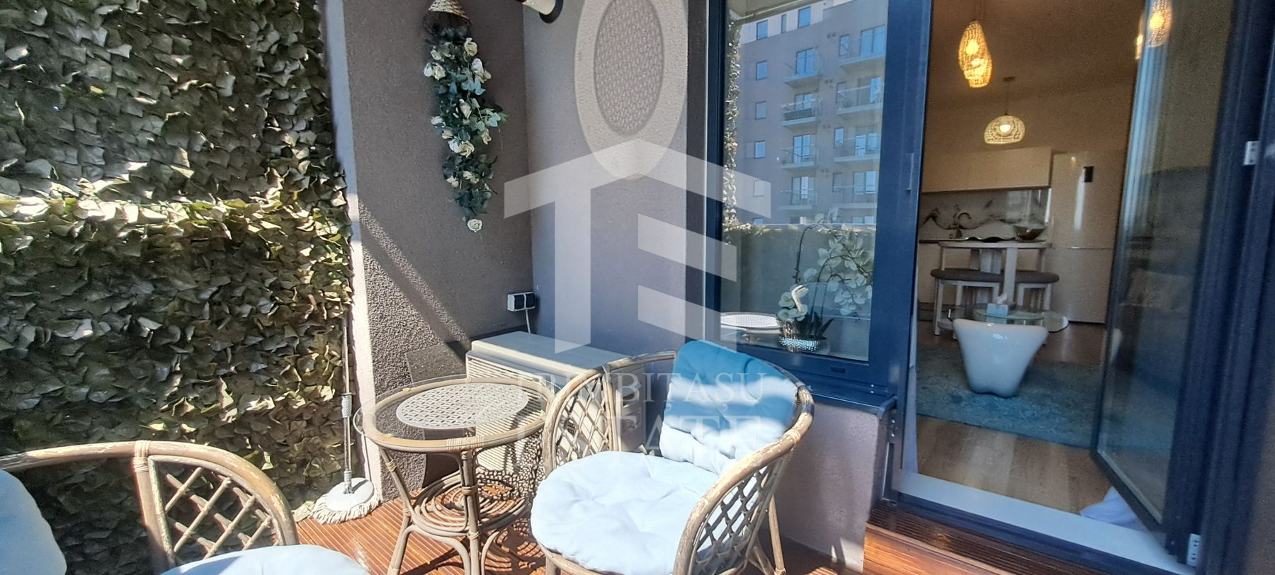 -zona de zi cu bucatarie deschisa; In camera de zi este si iesirea catre terasa deschisa, un loc frumos amenajat cu vedere catre curtea interioara si parc;