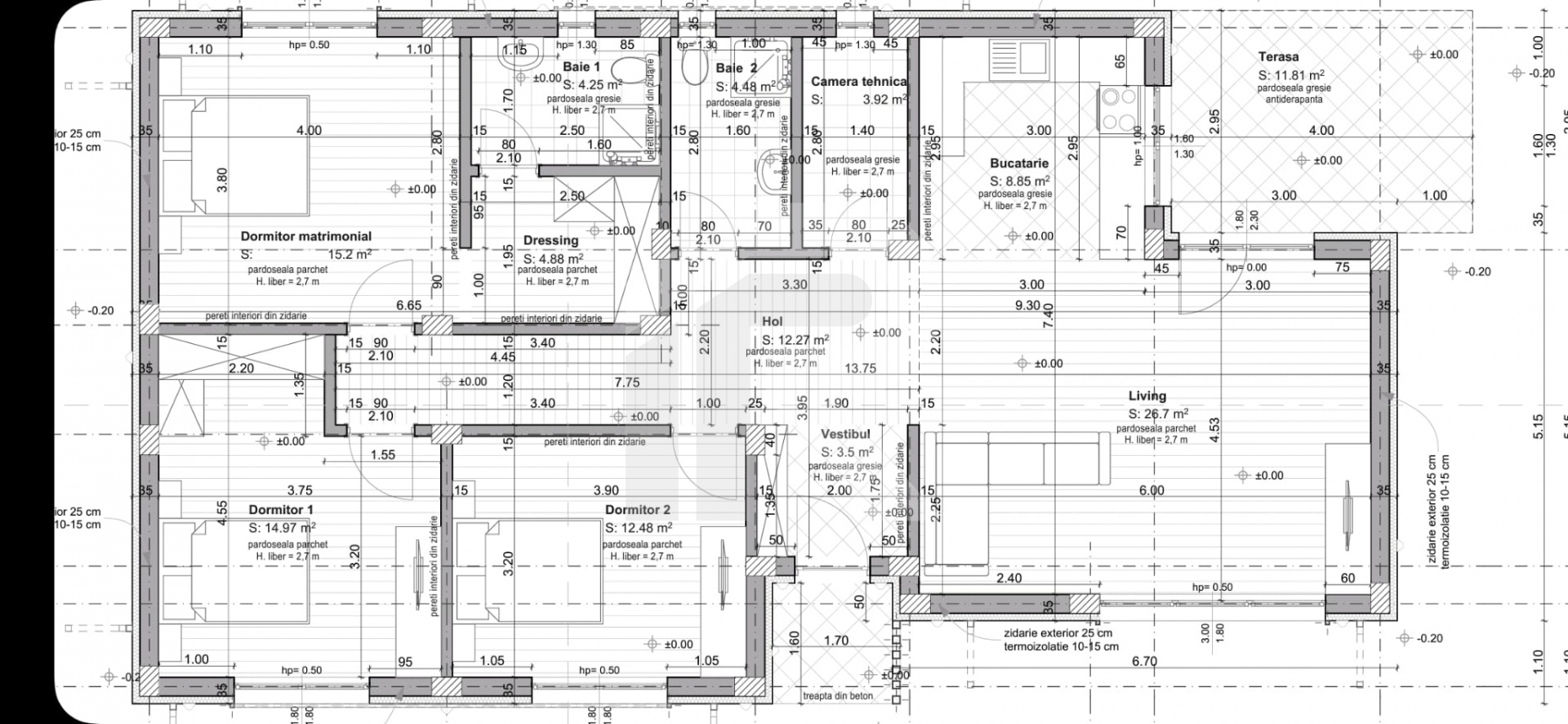 Celelelate doua dormitoare sunt pozitionate catre fatada principala si au acces la a doua baie localizata pe holul generos de 8mp.