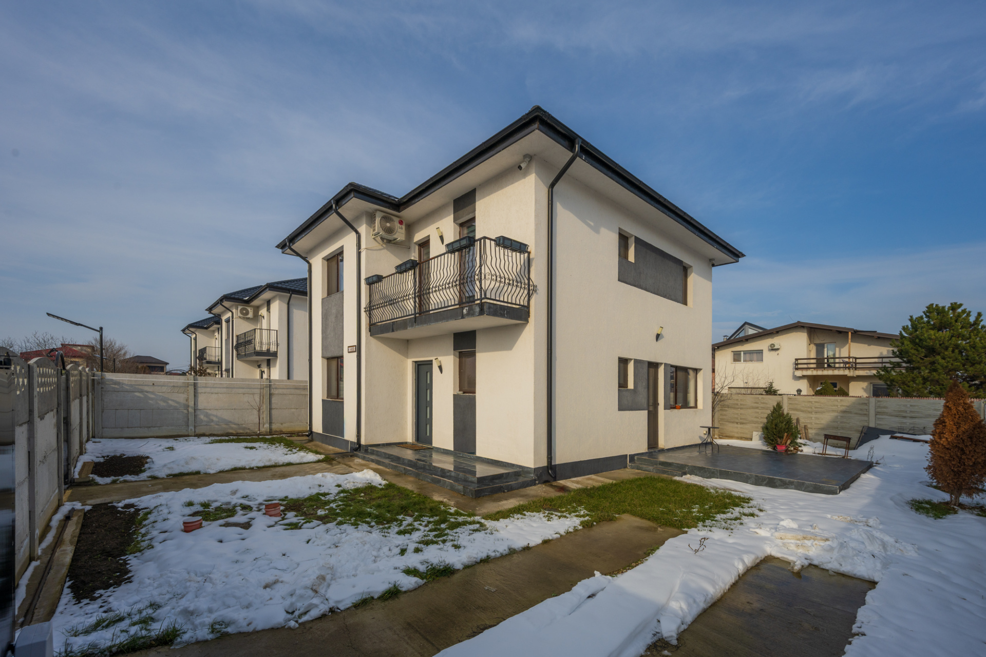 Casa face parte dintr-un proiect de 8 case individuale, finalizate in anii 2023-2024. Este construita pe un lot de teren in suprafata de 265 mp si este dispusa pe parter si etaj si beneficiaza si de un pod pentru depozitare. Casa are o suprafata totala de 129,5 mp, din care 114 mp sunt utili.