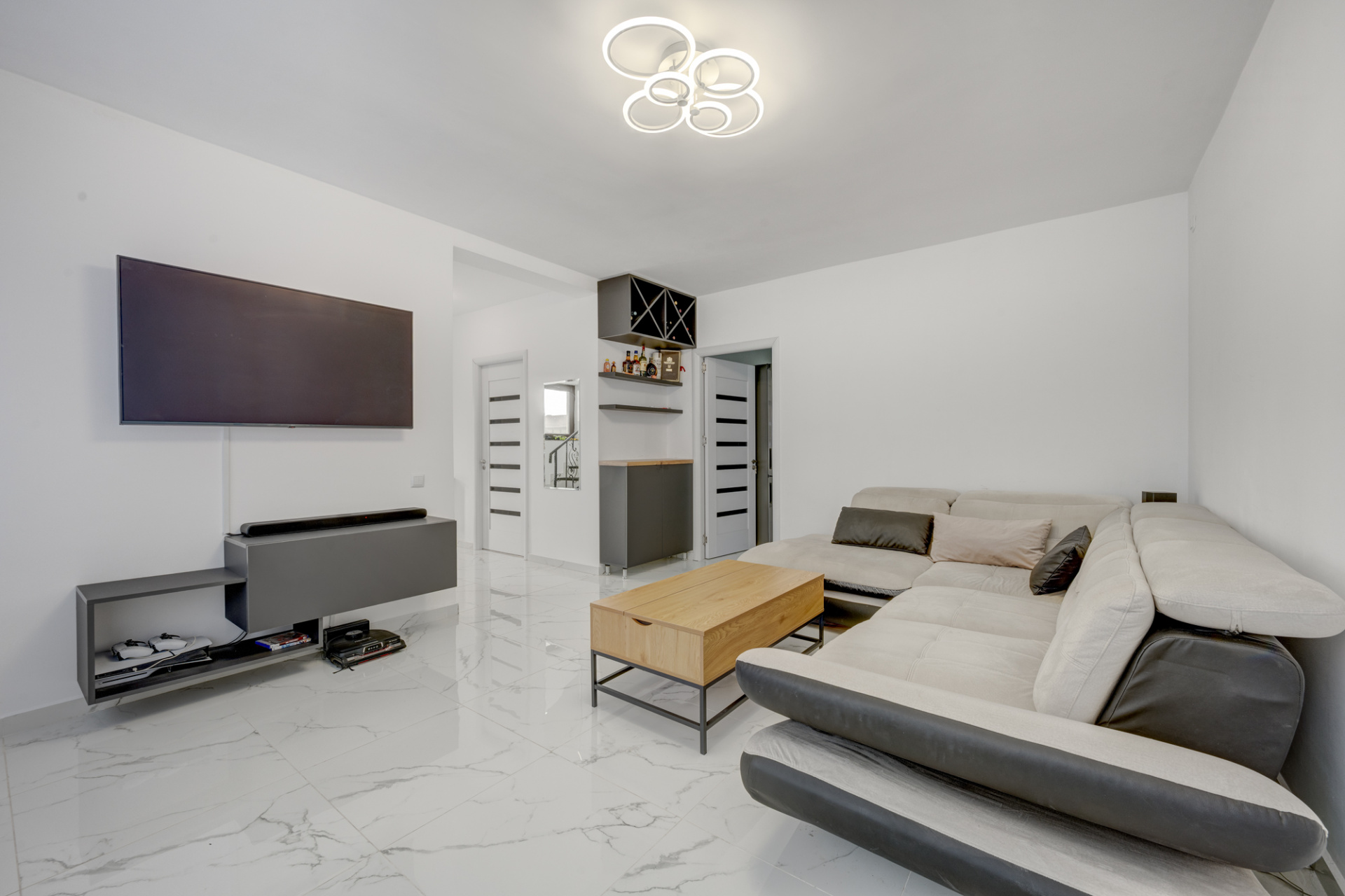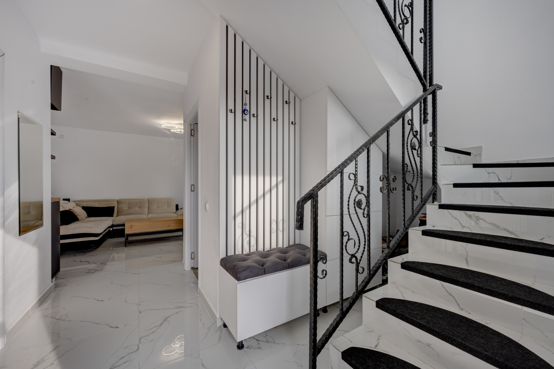 Bucataria este complet mobilata si utilata (aragaz, hota, masina de spalat vase, frigider). Dormitorul de la parter este amenajat cu un dulap generos si birou. Livingul este amenajat cu o canapea, comoda TV si spatii pentru depozitare. Fiecare dormitor are pat iar cel matrimonial are amenajat un dressing deschis.