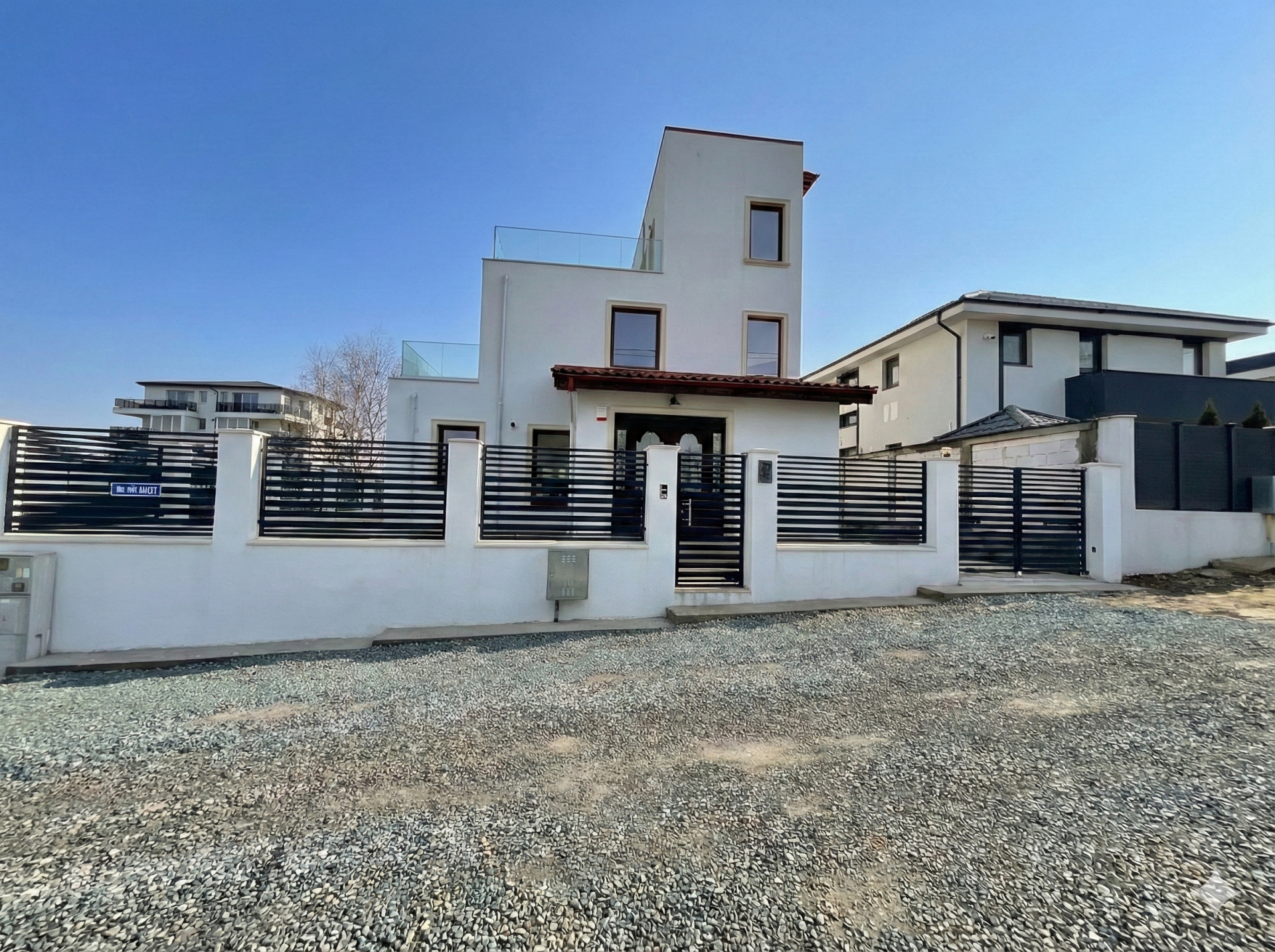Design modern, de tip cubist, cu terase generoase placate cu piatră naturală, dispuse în trepte, care oferă o panoramă superbă asupra zonei.